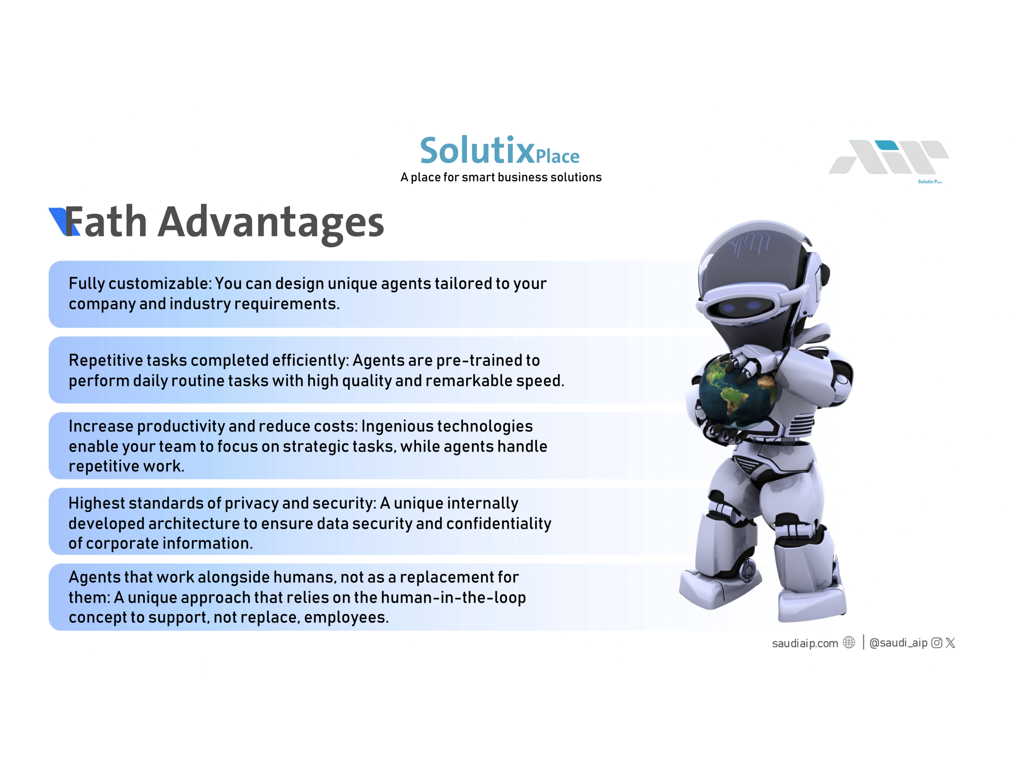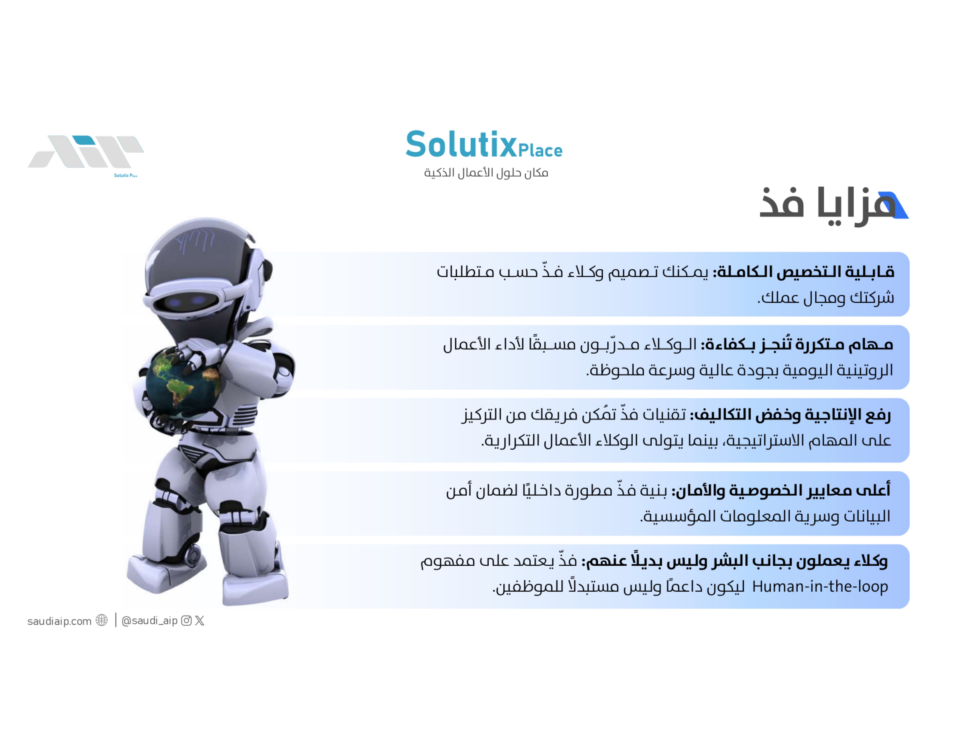 فذ هو منتج متكامل يضم أكثر من 90 وكيل ذكاء اصطناعي ( Al Agent ) مدربين على تنفيذ مهام متعددة داخل أقسام المؤسسة المختلفة حيث يدعم اللهجات السعوديـة في فهم المدخلات، عما يسهم في في تسريع الإنجاز، خفض التكاليف، ورفع كفاءة فرق العمل. حي يغطي فذ أكثر من 12 مجال ومنها :