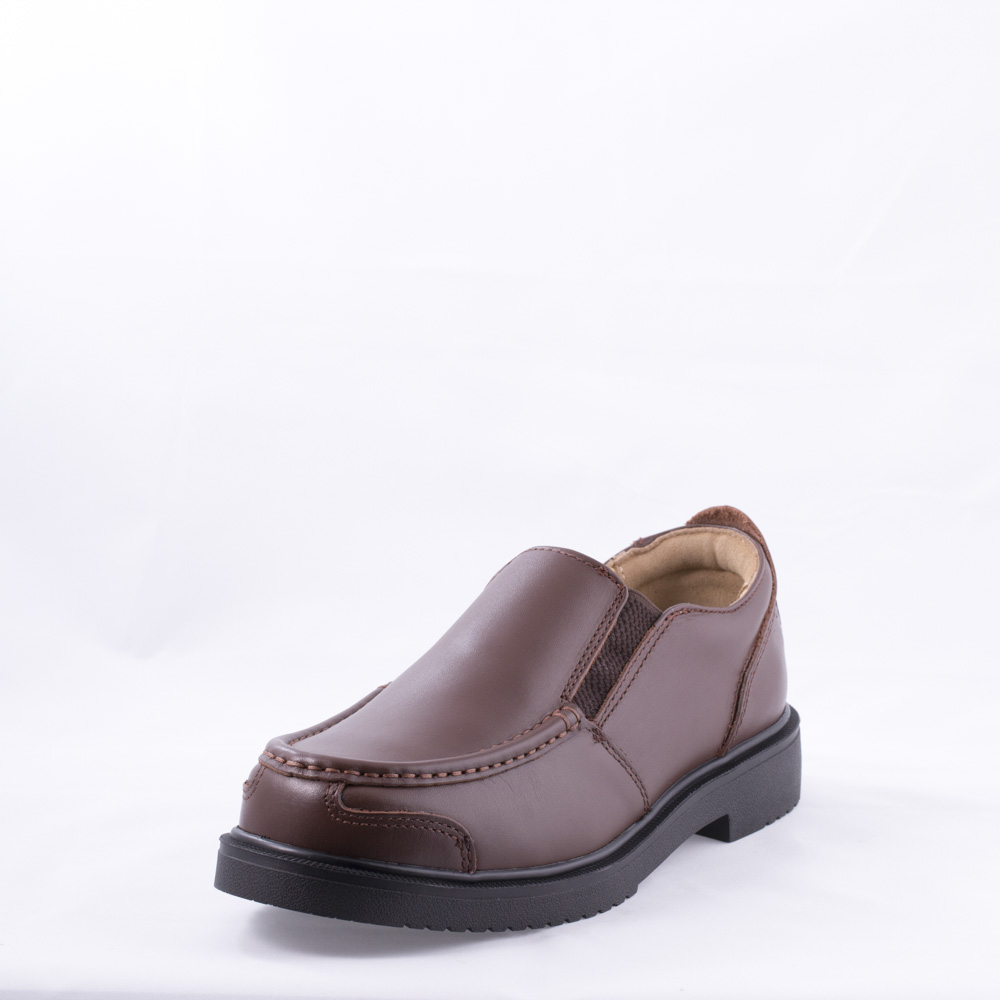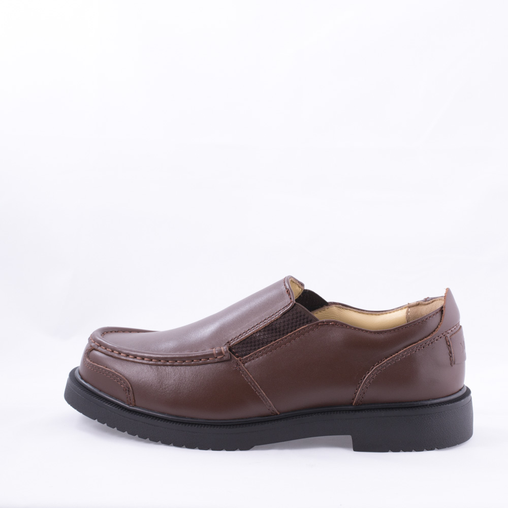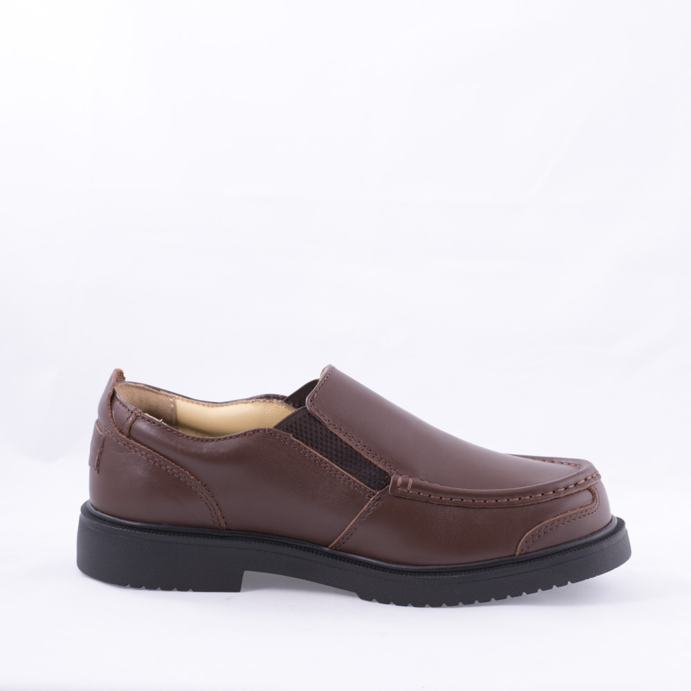 حذاء سلامة بني بدون رباط مع صدر مطاطي من الجهتين و المشط مخيوط يدويا. جلد بقر بني مدبوغ تماما وناعم. بطانة الجلد المجففه داخل الصدر / اللسان و المشط مبطن بإسفنج داخليا. ارضية بوليثرين مقاومة للإنزلاق مزودة بنظام تهوية مريحة. مقدمة مركبة غير فولاذية حسب المقاييس : ASTM & EN-12568. متاحة من 37-47.